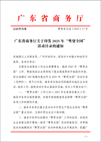 2025年2月7日,广东省商务厅关于印发2025年“粤贸全国”活动目录的通知,2025DMP 大湾区工业博览会入选2025年“粤贸全国”活动目录。