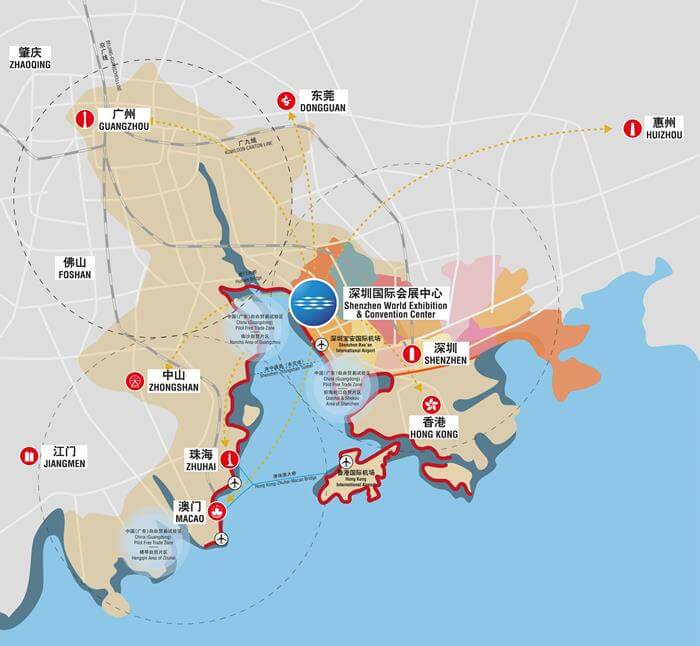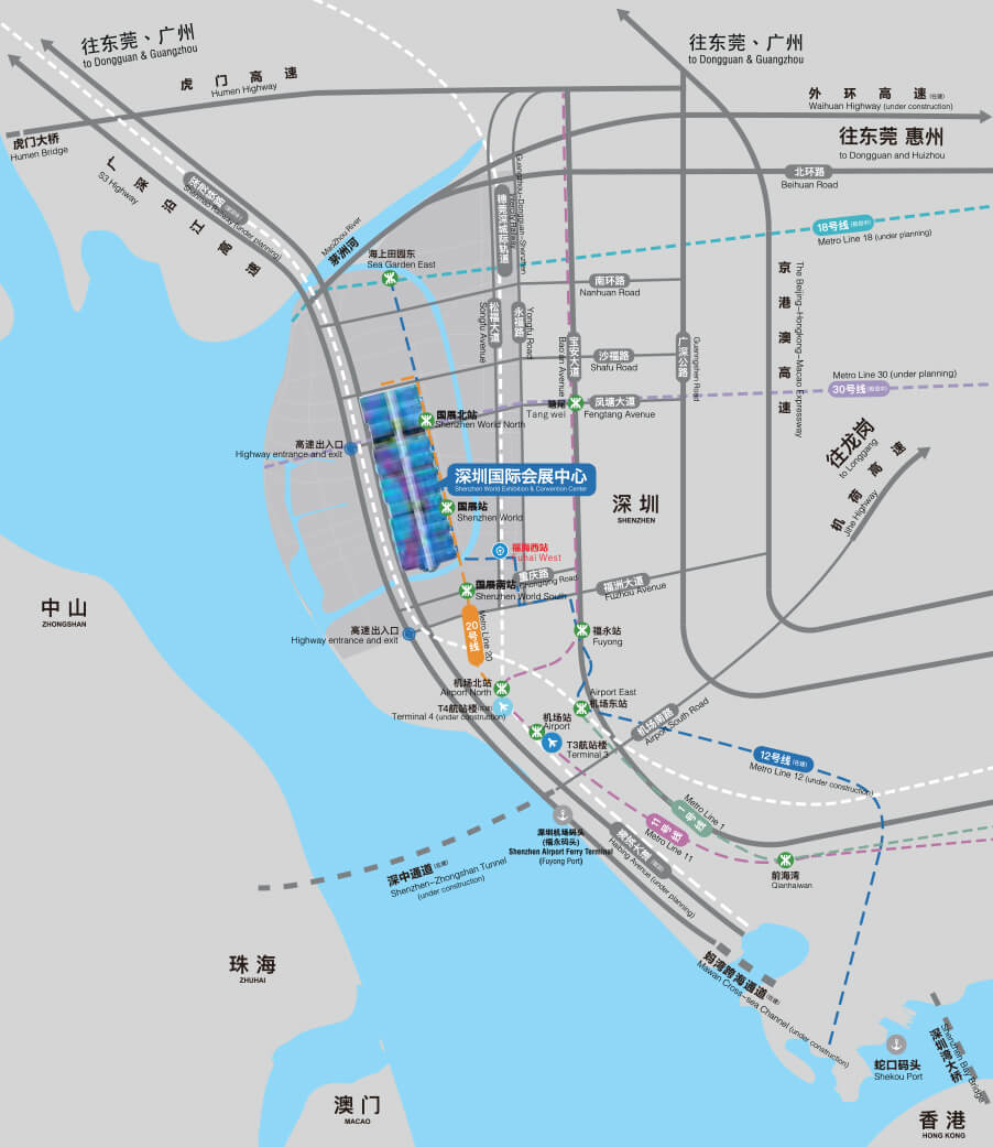 | 深圳国际会展中心位于深圳市宝安区展城路1号,紧邻深圳机场,地处粤港澳大湾区湾顶、珠三角中心和广东自贸区中心,广深港核心发展走廊和东西向发展走廊的交会处,广佛肇、深莞惠和珠中江三大城市圈交会处,地铁20号线、穗莞深城际线直达,区位优势突出,具有良好的资源集聚效应和庞大的发展潜力。 |