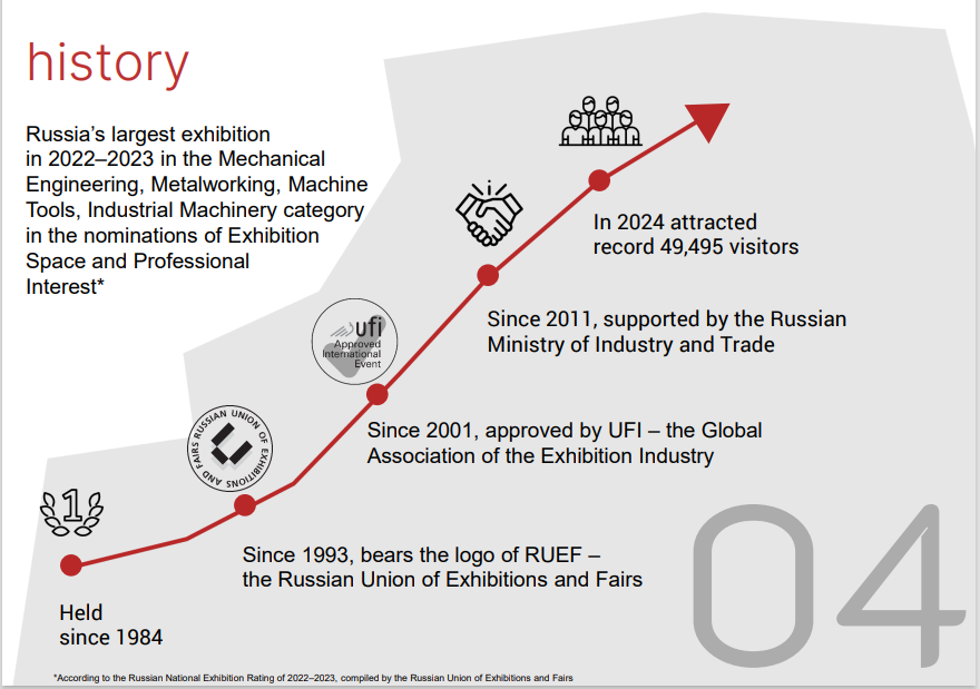 俄罗斯国际机床展览会(Metalloobrabotka)始创于1984年,由俄罗斯机床工具协会以及Expocentre展览中心共同主办,并由俄罗斯工业贸易部、俄罗斯工业家和企业家联盟以及欧洲机床工业合作协会支持,至今已成功举办24届,是俄罗斯第一大机床展。