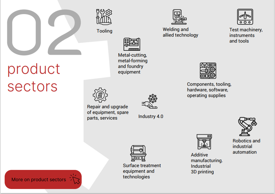 数控系统和程序监控;CAE/CAD/CAM系统、程序和软件;金属加工设备;自动化设施和刀库、工作台、操作装置;工业机器人;自动化仓储;传感器、自动化配套系统;全套电子设备、驱动装置;液压和气压设备、润滑和过滤装置;减压和电动减压器;统一组件、接合器、轴承、橡胶元件、耗材;控制系统和信息转换器;模具及附件;