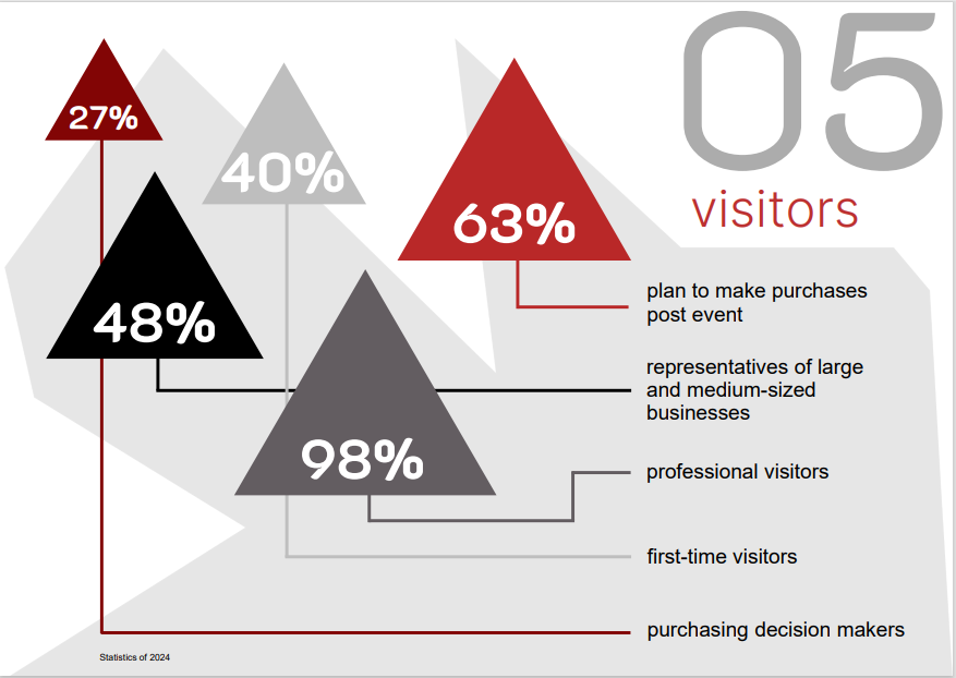 Metalloobrabotka 2024展出净面积约51142平方米,来自全球7个国家的1501家知名企业参展,同比增长约30%,专业观众累计49495人,同比增长约40%。专业参观者有来自机械制造、国防工业、航空航天、重型机械制造、机车车辆制造、石油和天然气工程、造船、冶金、发电厂工程、工业机器人和自动化等行业。