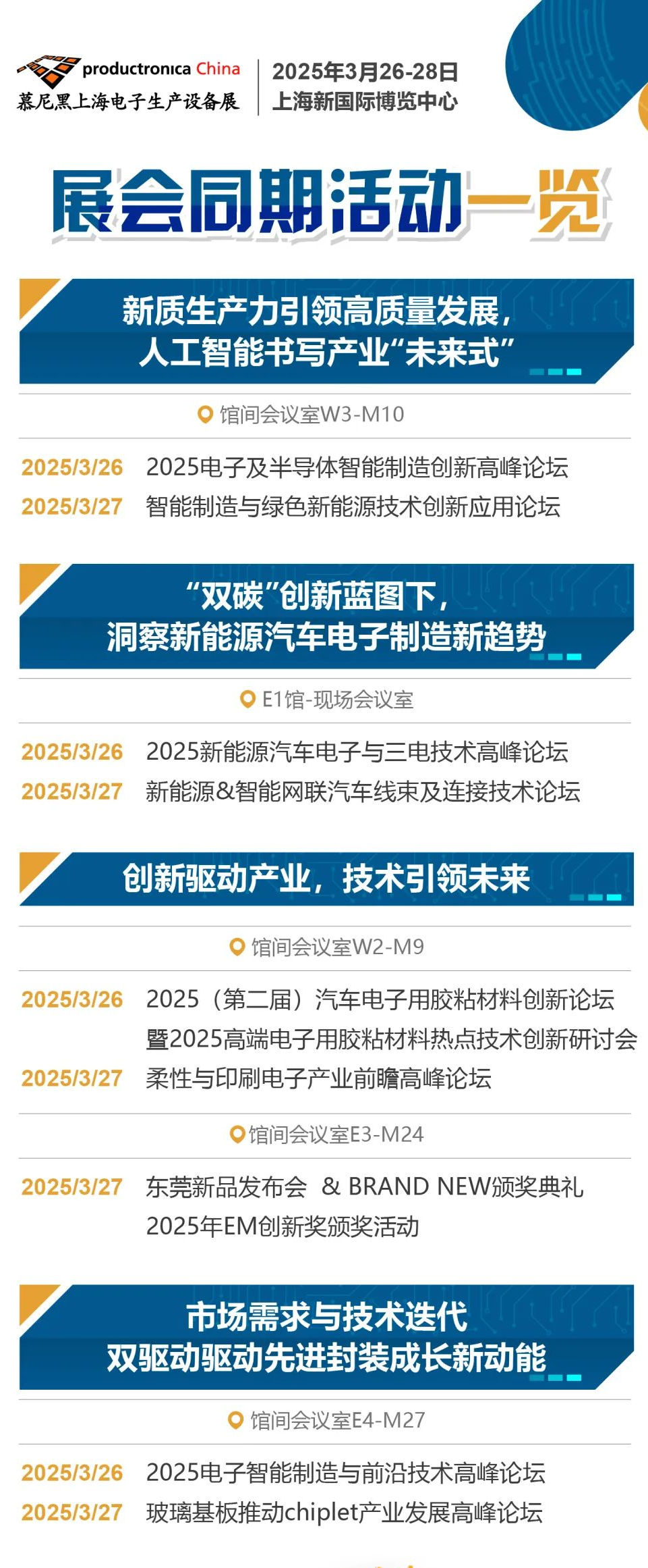 今年慕尼黑上海电子生产设备展将围绕四大行业主题开展共计8场同期论坛,主题分别为:新质生产力引领高质量发展,人工智能书写产业“未来式”;“双碳”创新蓝图下,洞察新能源汽车电子制造新趋势;创新驱动产业,技术引领未来;市场需求与技术迭代双驱动驱动先进封装成长新动能。在四大主题的细化及衍生之下,论坛围绕工业机器人、柔性制造、储能与新能源、汽车线束、智能座舱、智能制造、TGV先进材料、封装、胶粘剂、新能源汽车等热门话题展开更多探讨与交流。