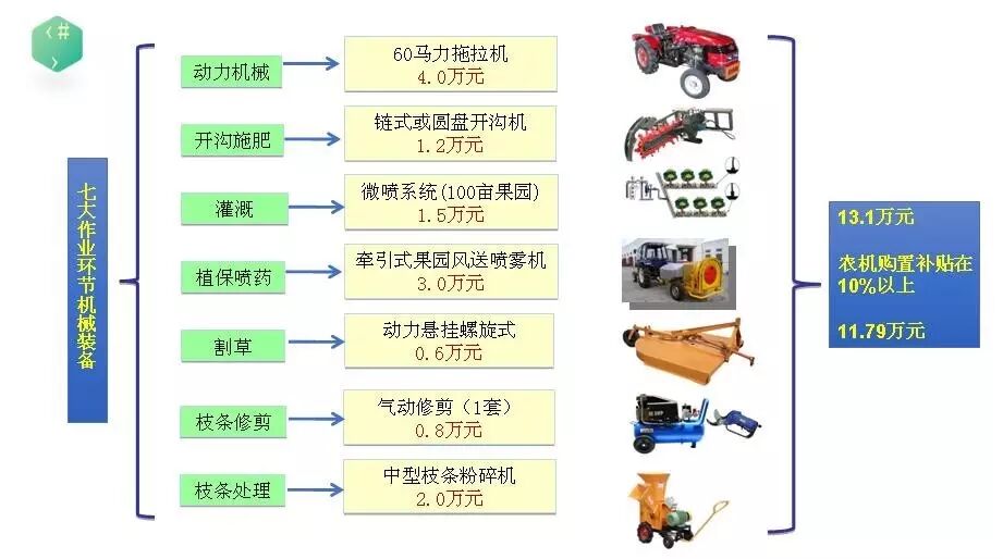 我们以100亩果园为例,计算一下除去花果管理机械装备,配备七大作业环节机械装备的机械成本共计13.1万元,除去10%以上的农机购置补贴,实际花费约11.79万元。全年使用7大机械装备可节本7万元以上,2年即可回本收益。果园面积较大时,当年即可获得较大收益。