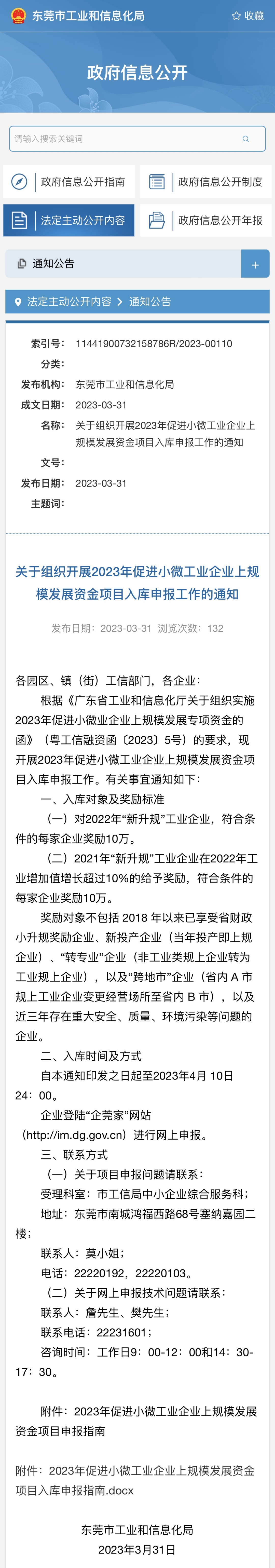 2023年3月31日,东莞市工业和信息化局发布了《关于组织开展2023年促进小微工业企业上规模发展资金项目入库申报工作的通知》,通知如下: