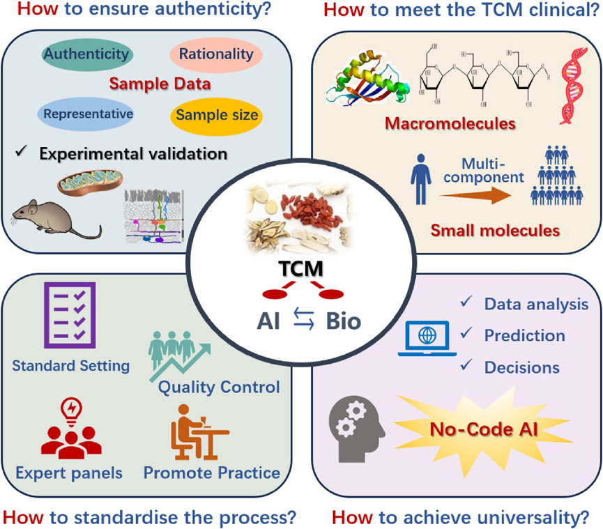 人工智能为中药质量控制带来显著效益,但也面临诸多限制。首先,中药的复杂性,包括品种、成分、产地、炮制等因素,使得数据采集和管理变得复杂,数据不完整、不准确、不一致,影响人工智能模型的准确性。其次,中药行业的人工智能从业者需要精通中药和人工智能,但这样的人才非常稀缺。此外,现有的法规可能跟不上人工智能的快速发展,给中药企业带来风险。最后,中药生产的智能化升级,既要保留传统工艺,又要创新,也增加了挑战。此外,尽管人工智能与生物信息学技术的结合具有显著优势,但人工智能在判断生物信息的真实性方面存在不足。生物信息数据的不一致不仅可能导致信息丢失或误解,从而影响人工智能模型的准确性,还会因某些生物信息数据的缺失而导致模型构建缺乏必要的完整性。总而言之,作者将问题分为四类,如何评价详细描述了当前情况和潜在的解决方案。包括(1)如何评价预测结果的真实性?(2)如何临床适用并符合中医特点?(3)如何确保流程标准化、规范化?(4)如何实现普遍化?