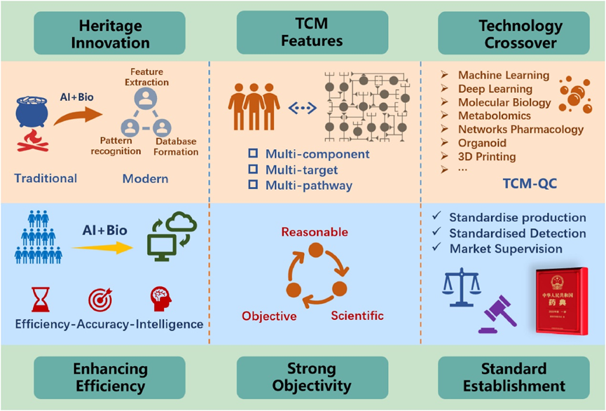 中药质量可控性是中药安全性和有效性的基石。在工业4.0时代,全球中医药质量控制将发生哪些重大变革是当前亟待关注的问题。在此,作者前瞻性地从人工智能和生物信息学的角度,揭示智能时代中药质量控制的进展。整合复杂性、技术创新和产出,展示两个方向在中药质量控制中的独特优势。此外,作者还对不足之处进行了深入的分析,并提出了潜在的专业化解决方案。在新的质量生产力中,前瞻性地、系统地展望了未来优质中药形成、智能检测和监管科学等交叉领域的重要方向。本综述致力于洞察中药质量控制的智能化。对指导中药国际化具有深远意义。