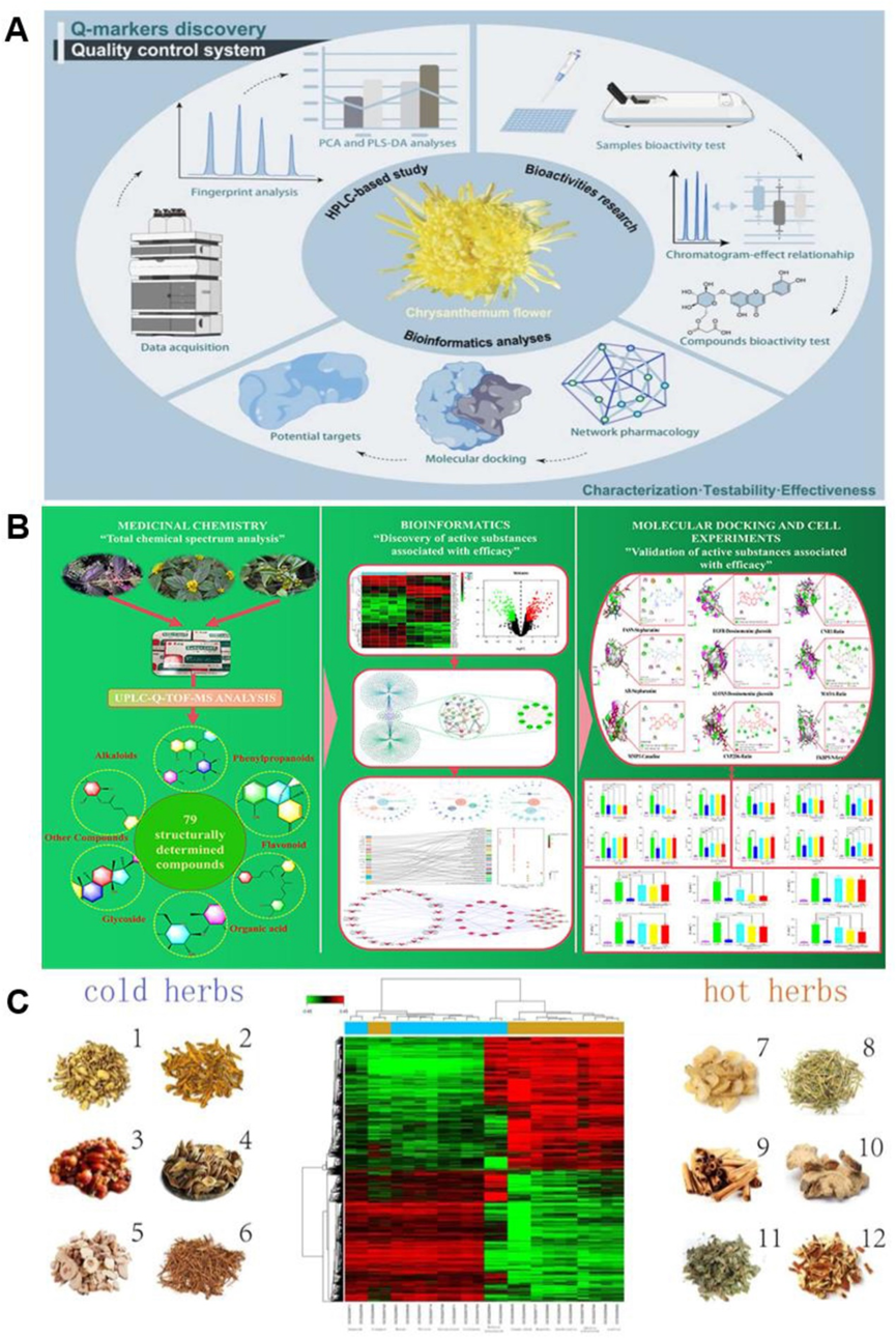 图8. 生物信息学在中药质量控制中的应用。A:基于色谱-效应关系和生物信息学分析的食用菊花Q-markers发现和质量评估的综合方法;B:苗药黑固藤追风活络胶囊的化学成分分析及治疗类风湿性关节炎的有效物质的发现;C:基于生物信息学分析鉴定与中药寒热性质相关的途径和基因