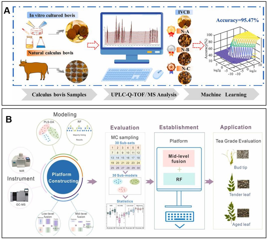 图7. 中药等级评定。A: 结合组学策略和机器学习算法对不同来源牛黄一致性的综合评价;B:结合机器学习技术与数据融合策略:茶叶等级鉴别平台
