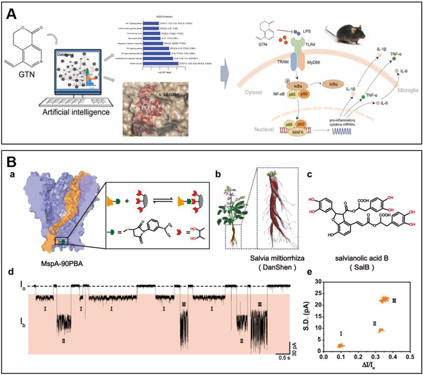 图6. 中药质量标志物筛选。A:机器学习能够发现龙胆碱靶向TLR4/NF-κB通路以修复缺血性中风损伤; B:草药中丹酚酸的纳米孔分析