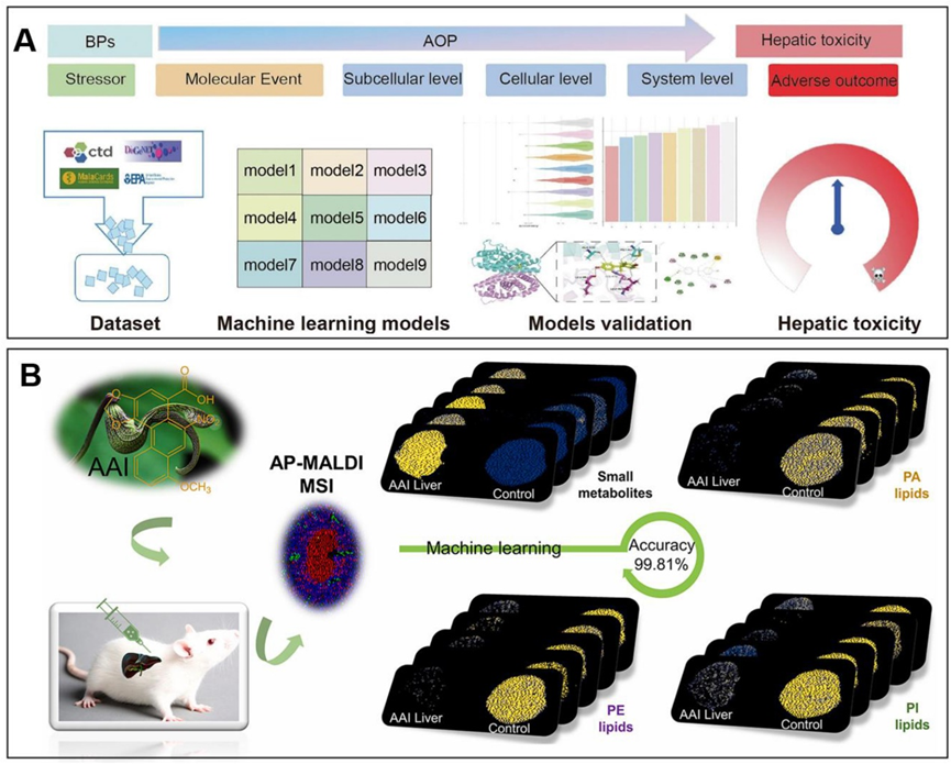 图4. 中药内源性毒性成分预测。A:通过机器学习策略预测双酚类似物的肝毒;B:通过大气压基质辅助激光解吸/电离质谱成像和机器学习对马兜铃酸I暴露小鼠肝脏代谢的研究