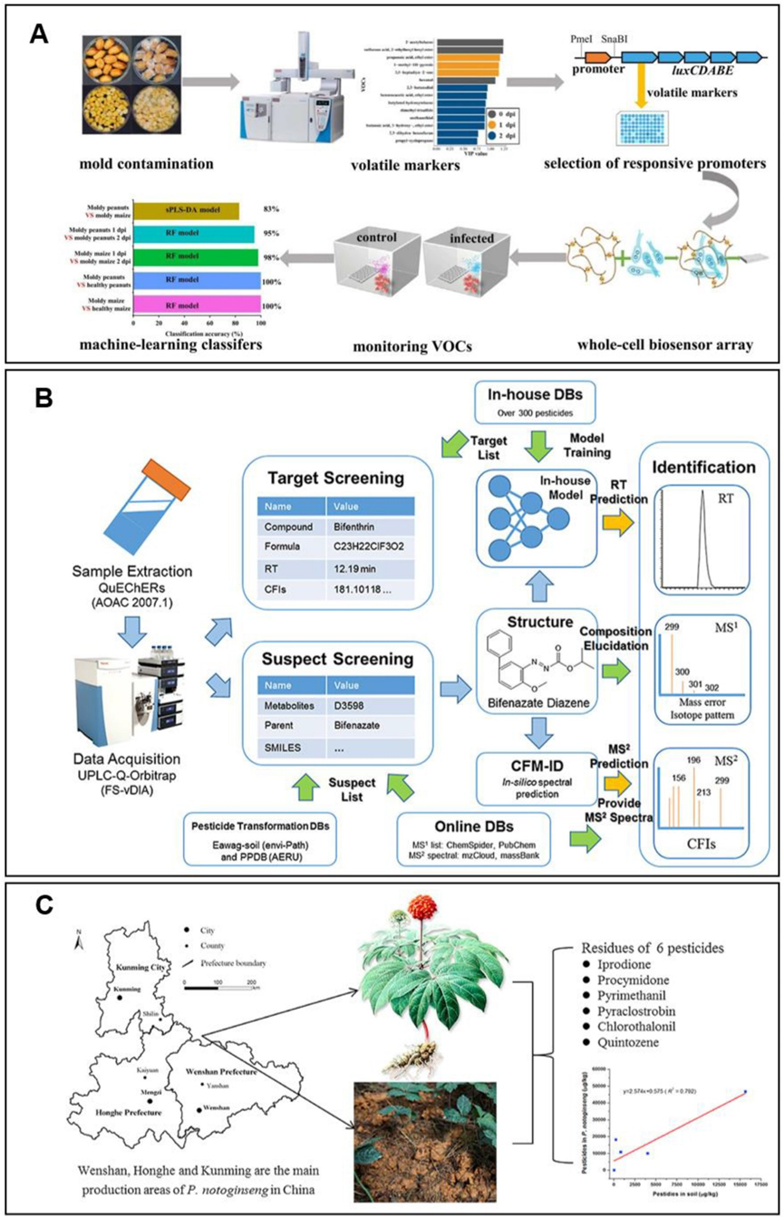 图5. 中药外源性有害残留监测。A:基于全细胞生物传感器阵列结合机器学习预测模型对食品中霉菌污染进行精准无损监测;B:基于机器学习的保留时间预测在LC-HRMS中对农药及农药转化产物可疑物筛查的评估及应用;C:华南地区三七种植土壤中的农药残留及其与土壤的关系