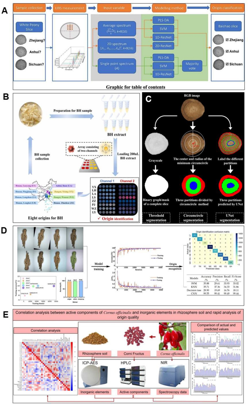 图3. 高光谱成像、化学成分、元素指纹、计算机视觉和微区域结构在中药产地鉴定中的应用案例。A:基于传统机器学习和深度学习的激光诱导击穿光谱法快速鉴别白芍饮片产地;B:机器学习辅助视觉传感器阵列用于百合球茎产地识别;C:通过U -Net精细结构识别辅助高光谱成像提高甘草产地分类准确率;D:基于计算机视觉和深度学习的当归产地智能识别;E:近红外光谱结合机器学习对山茱萸有效成分与根际土壤无机元素的相关性分析及产地品质的快速分析