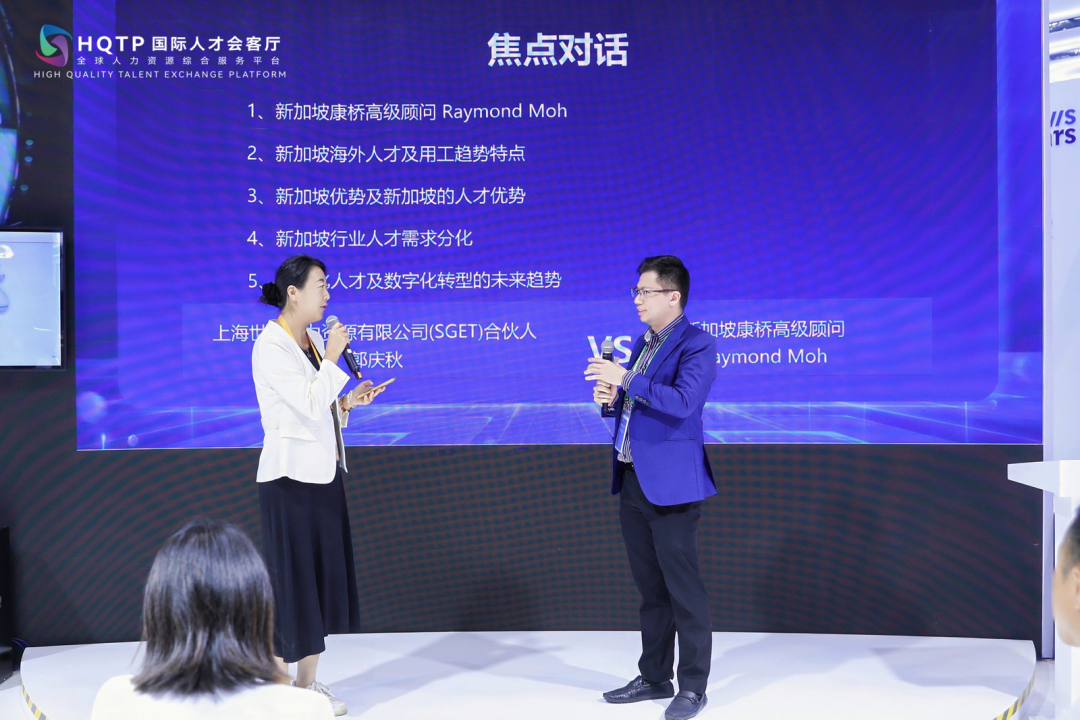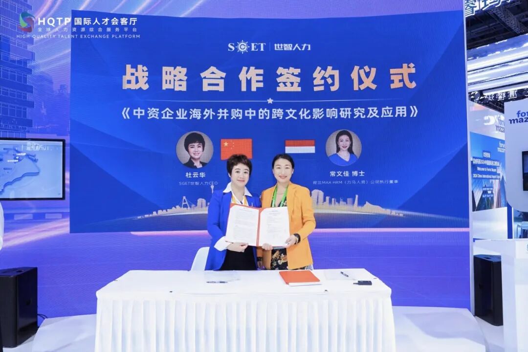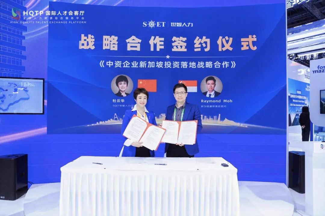在焦点对话环节,SGET世智人力合伙人郭庆秋女士作为主持人与新加坡康桥高级顾问Raymond  Moh先生,围绕“新加坡的人才及用工趋势”的主题,展开了精彩对话。在当今全球化的时代,海外人才市场的重要性日益凸显。新加坡海外人才及用工趋势呈现出高技能人才需求持续增长、中小企业数字化转型推动用工结构变化以及劳动力市场紧张与本地就业饱和等特点。战略合作签约仪式