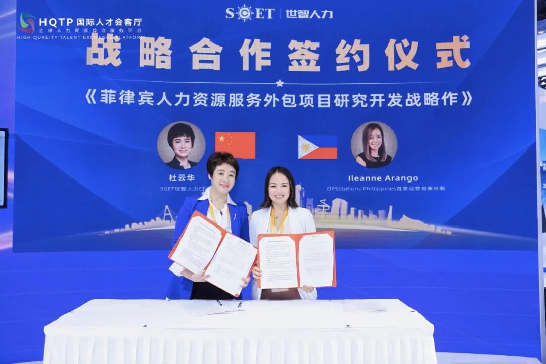 当日重磅的战略签约活动仪式拉开帷幕,中美法律交流基金会创始人兼理事会主席张红女士、OPSOURCE PH(菲律宾)首席运营官兼总裁 Ileanne Arango 女士、新加坡康桥高级顾问Raymond  Moh先生、荷兰MAX HRM(力马人资)公司执行董事常文佳博士、88JOBS市场总监Benjamin Gatard先生和塞尔维亚华人商业联合会会长郭晓先生,分别与SGET GROUP 世智人力CEO 杜云华女士签署战略合作协议并拍照留影。通过加强国际战略合作,促进东南亚与欧洲在人才流动、用工合作以及劳动力市场发展等,共同推动全球经济的繁荣与发展。