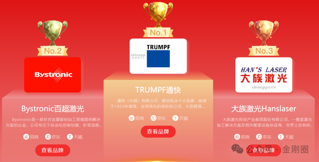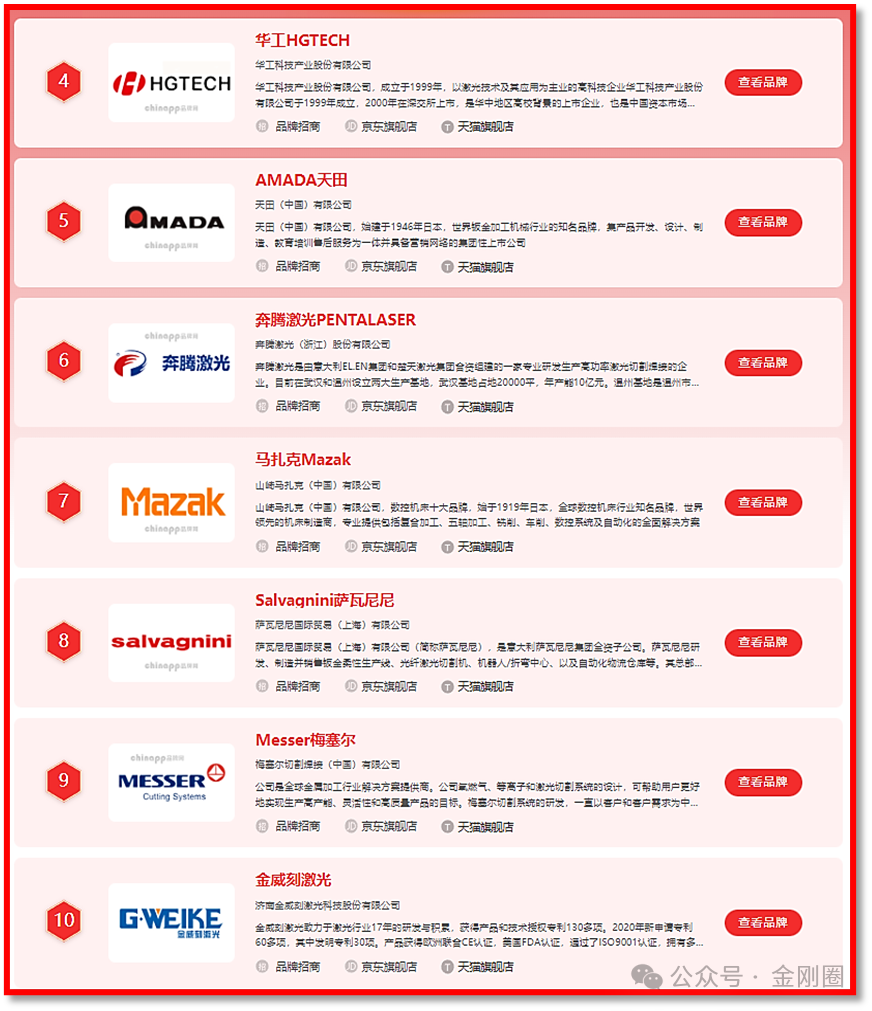 点评: 金威刻激光发展较晚,后发优势,专业做激光切割机,专业,速度占有一席之地,是国产品牌的希望之星。性价比出众。激光切割,钣金折弯,柔性线都是发展方向。