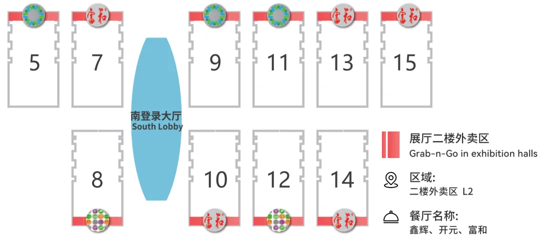 • 展厅内外卖区:5、7-15号展厅二层均设外带餐饮区