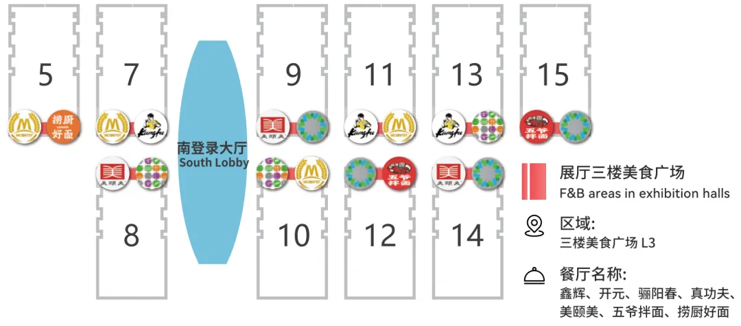 • 展厅内餐饮区:5、7-15号展厅三层均设餐饮区;