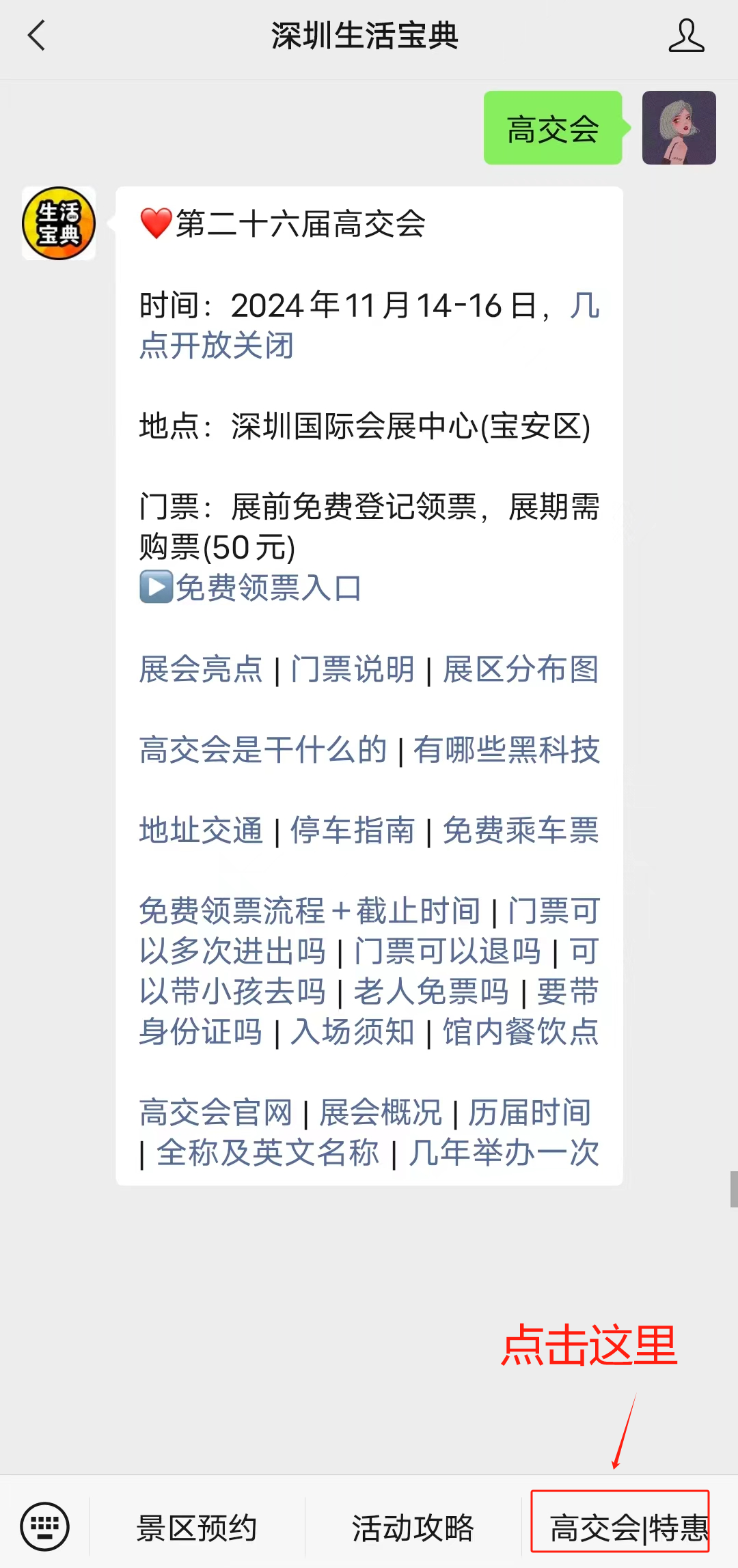 免费领票入口:高交会官网官微,长按识别或扫描下面二维码,关注深圳生活宝典微信公众号,点击公众号底部菜单栏【高交会|特惠】-【2024高交会观展攻略】即可获取深圳高交会免费领票入口,查看高交会具体开放时间、地址交通、停车场指南、免费公交地铁乘车票领取及使用说明、展会官网入口、展会介绍、展会看点