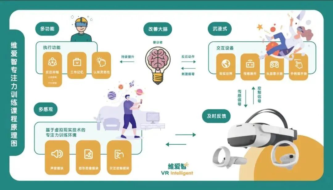 维爱智VR注意力训练中心是将VR(虚拟现实)与感觉统合训练、数字疗法、发展心理学等临床理论与实践相结合,借助逼真的沉浸式场景,通过科学化、智能化,以多场景、多功能、多梯度的方式进行专注力提升的训练系统。