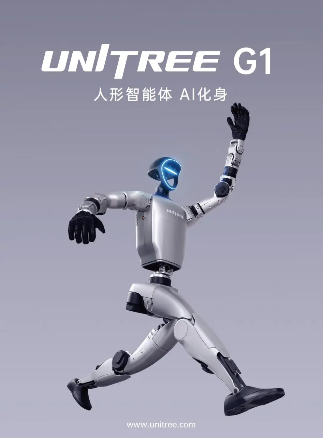2024年推出的人形机器人G1拥有23~43个关节电机,身高约127厘米,体重约35公斤,具备超越常人的灵活性,解锁无限运动潜力。G1小跑速度大于2m/s,立定跳远最远可达1.4m,可完成高难度动态动作,如动态站起、坐下折叠、舞棍等。基于深度强化学习和仿真训练,G1借助AI技术不断升级演进。