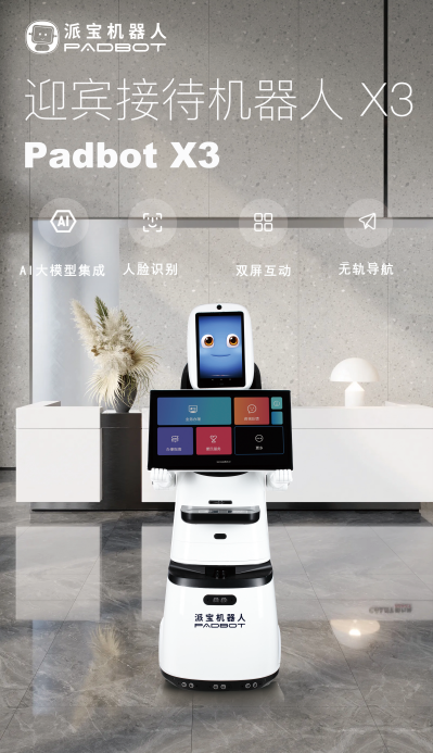 派宝迎宾接待机器人X3已经全面接入deepSeek-R1推理模型,机器人在语音识别、语义理解、语音合成、决策判断、运动控制等方面具备自主深度学习能力及推理能力。能轻松实现跨楼层无人导览、人脸识别、主动唤醒、无轨自主导航等功能,满足智慧酒店迎宾接待、跨楼层带路、大堂咨询讲解等进阶需求。