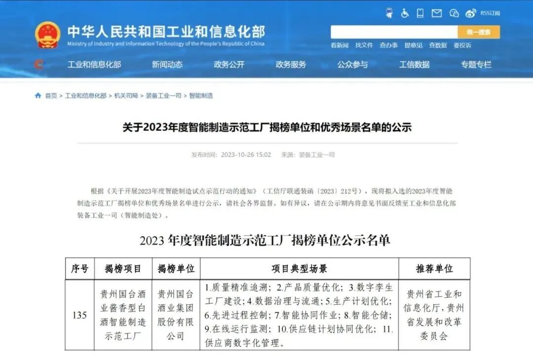 近日,工业和信息化部公示“2023年度智能制造示范工厂揭榜单位”和“2023年度智能制造优秀场景”名单,此次评选由工业和信息化部、国家发展改革委、财政部、国务院国资委、市场监管总局五部门联合发起。贵州国台酒业集团进入“2023年度智能制造示范工厂”公示名单,成为贵州省唯一入选的白酒企业。