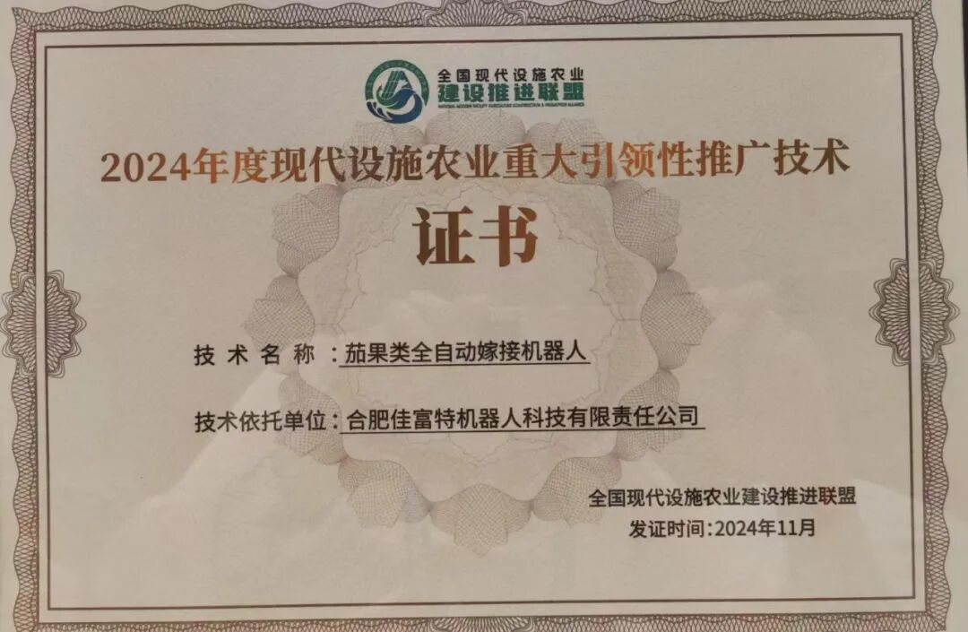 同时,本次大会上发布了2024年现代设施农业重大引领性推广技术并颁发证书,佳富特茄果类全自动嫁接机器人作为第一项重大引领性推广技术重磅发布。