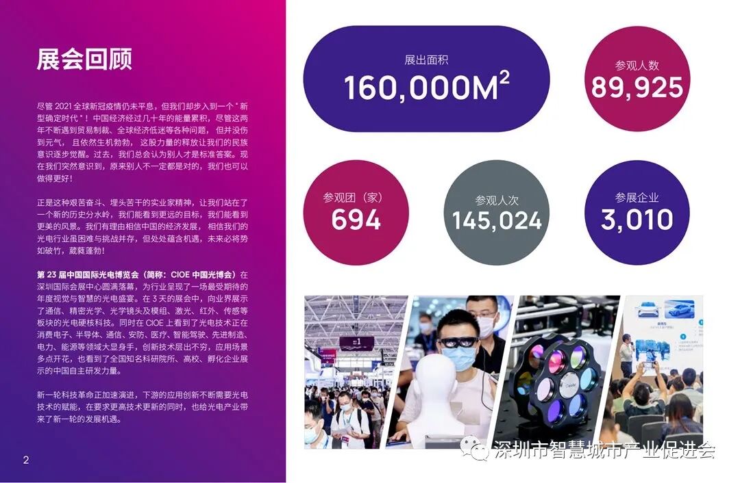 ▶ 展示面积与观众:16万展示面积,吸引了89925名专业观众,97.59%的观众对2021年展会总体表示满意或非常满意,96.65%的观众表示会继续参观,97.55%的观众愿意向同事及行业伙伴推荐CIOE中国光博会;