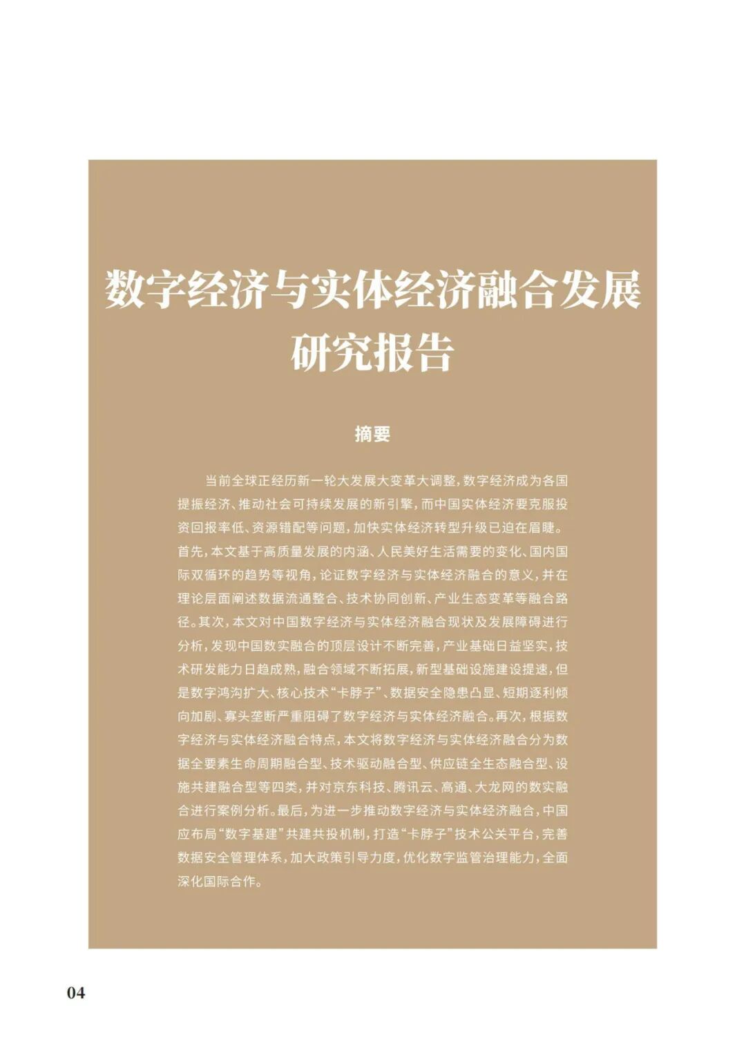 报告将数字经济与实体经济融合分为数据全要素生命周期融合型、技术驱动融合型、供应链全生态融合型、设施共建融合型等四类,并对京东科技、腾讯云、高通、大龙网的数实融合进行案例分析。最后,为进一步推动数字经济与实体经济融合,中国应布局“数字基建”共建共投机制,打造“卡脖子”技术公关平台,完善数据安全管理体系,加大政策引导力度,优化数字监管治理能力,全面深化国际合作。