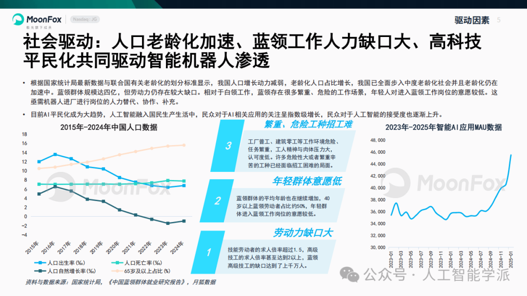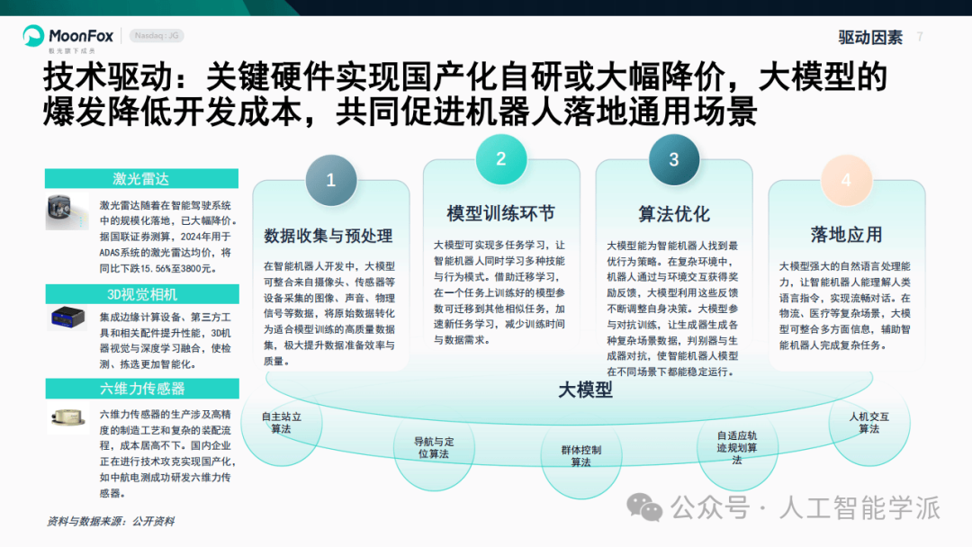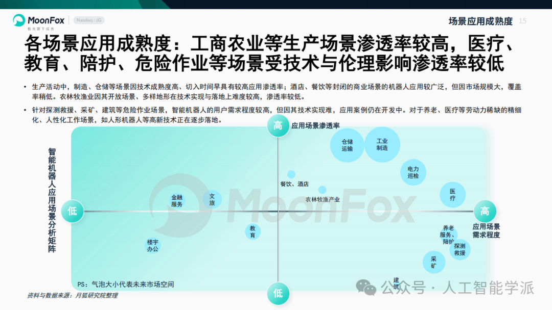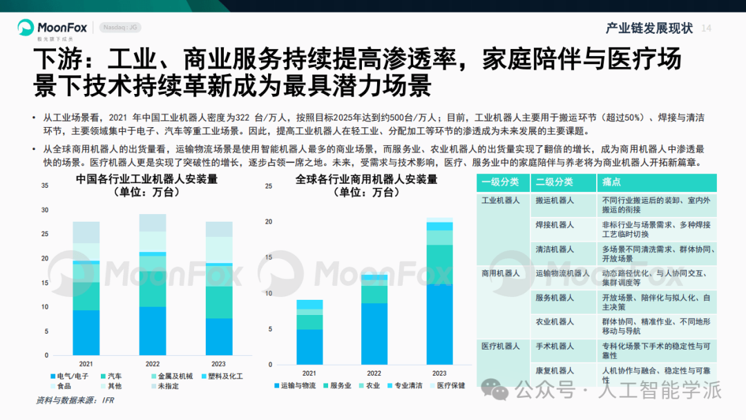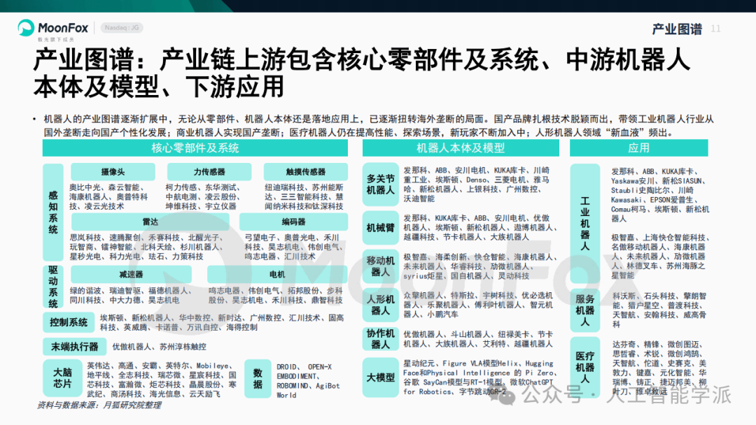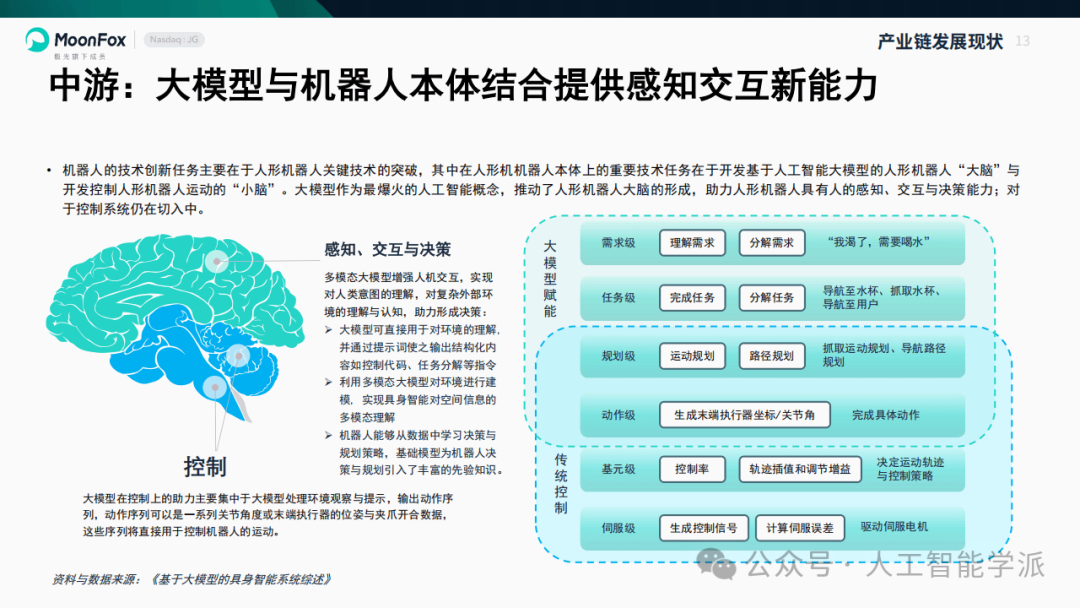 智能机器人产业正处于快速发展阶段,其定义为加入智能技术,能实现自主感知、交互、决策、执行操作的机器人,涵盖工业、服务、特种等多种类型。该产业的发展受社会、政策、技术和产业环境等多方面因素驱动。社会层面,人口老龄化加速、蓝领人力缺口大以及高科技平民化推动其渗透;政策上,从国家到地方出台多项政策支持产业发展;技术方面,关键硬件国产化或降价、大模型发展降低开发成本;产业环境良好,中国智能机器人产业企业数量增长、融资稳定,专利数量占全球约2/3。在发展现状上,产业链逐渐完善,上游传感器和关节执行器成为发展重点,部分部件国产化率提高;中游大模型与机器人本体结合提升感知交互能力;下游工业、商业服务渗透率上升,家庭陪伴和医疗场景潜力大,但各场景应用成熟度存在差异。产业内典型案例众多,工业领域国产企业崛起,提供多环节解决方案并探索群体智能;商业服务场景多样,如普渡机器人应用广泛;家庭服务和养老服务场景中,人形和四足机器人不断开拓;医疗领域手术和康复机器人发展迅速。未来,智能机器人技术上大模型、数字孪生、群体智能将推动具身智能发展,应用上会开拓核电站巡检、太空作业等新场景并拓展全球版图,但产业发展面临国产替代、规模化应用、伦理与安全等问题,需通过加强技术研发、完善法规、开展伦理教育等方式推动可持续发展 。