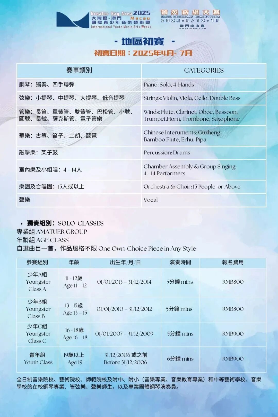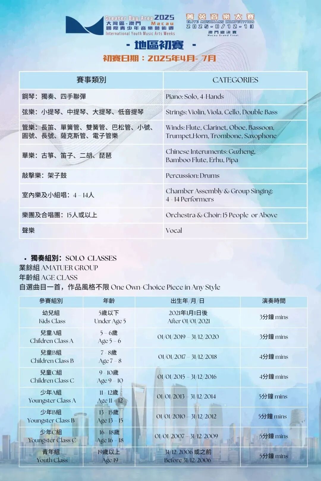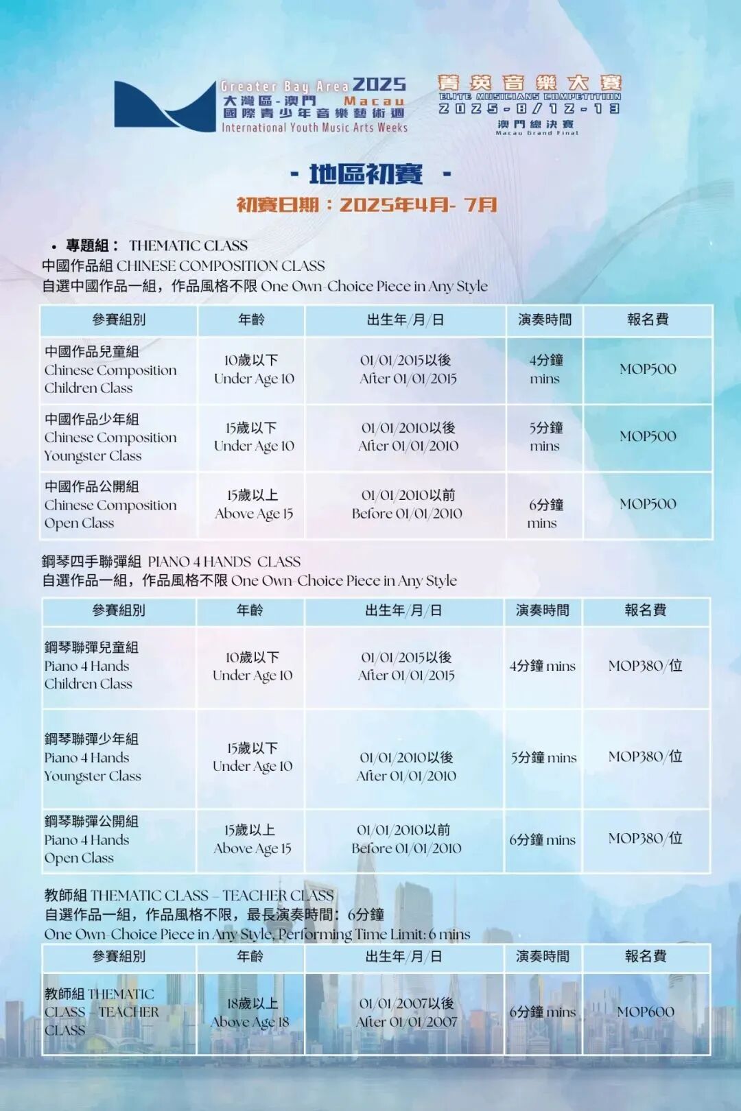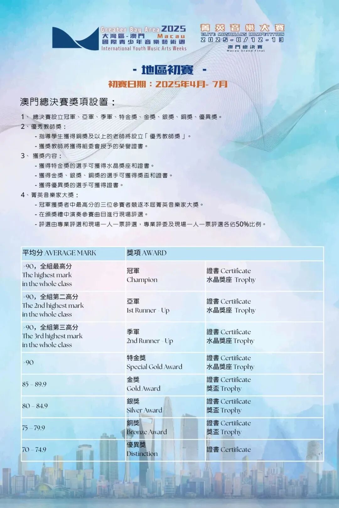 國際青少年交響音樂節(澳門)暨音樂菁英大賽,由亞洲鋼琴教師協會(澳門)旨在透過音樂的連結, 在世界各地的青少年之間建構友誼與文化的橋樑,尋找傳承音樂美學的藝術火種,並協助他們創造人生中閃耀的時刻與寶貴的進階之路。