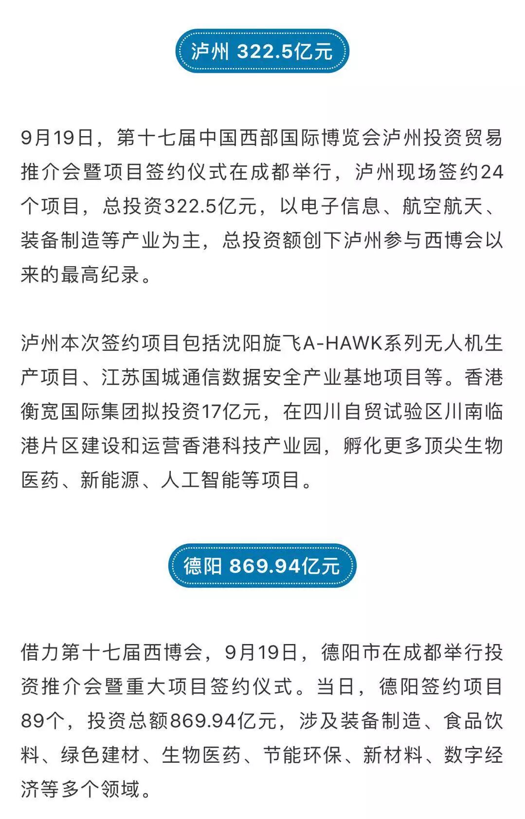 9月19日,在第十七届中国西部国际博览会期间,达州市"6+3"产业投资说明会暨合作项目签约仪式在成都举行,活动共签约重点项目92个,投资额688.54亿元。签约项目涉及智能装备制造、文化旅游、电子信息等多个领域,总投资额创下达州参与西博会以来的最高纪录。