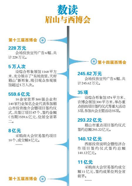 第十七届西博会,位于西博城的眉山展区规划展览面积达2250㎡,将充分展示天府新区核心区魅力,显示眉山打造大都市区南部副中心的实力,还将携手主宾国走进眉山,共享一带一路发展机遇。