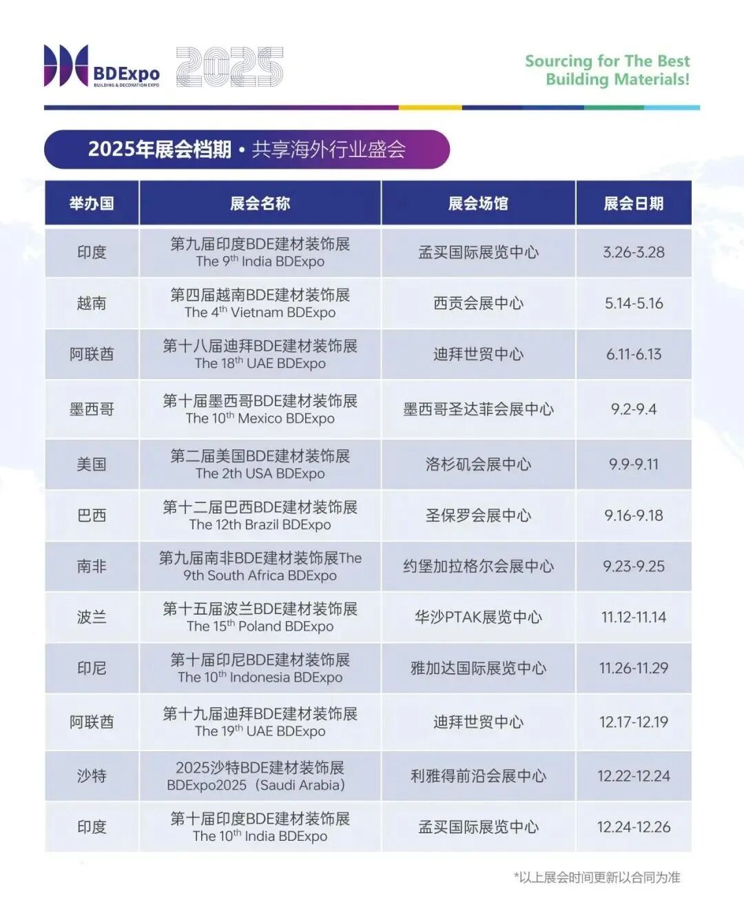 BDEXPO建材装饰展,致力于为全球建材行业提供一站式解决方案。BDEXPO覆盖全球10多个国家和地区,是集市场商机探索、创新产品展示、商业贸易合作为一体的专业展会平台。