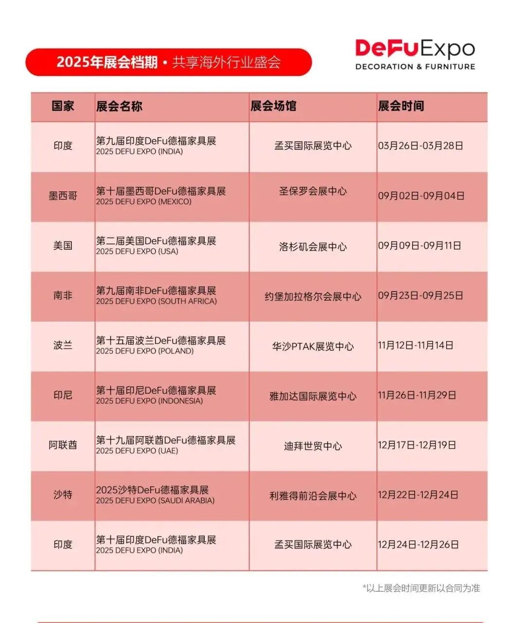 DeFu Expo德福家具展是专注于引领中国家具产业出海发展专业展览平台。展会自综合型贸易展起步,在经历了近十五年境外耕耘后,展会朝着产业垂直、引领行业的发展方向应运而生。