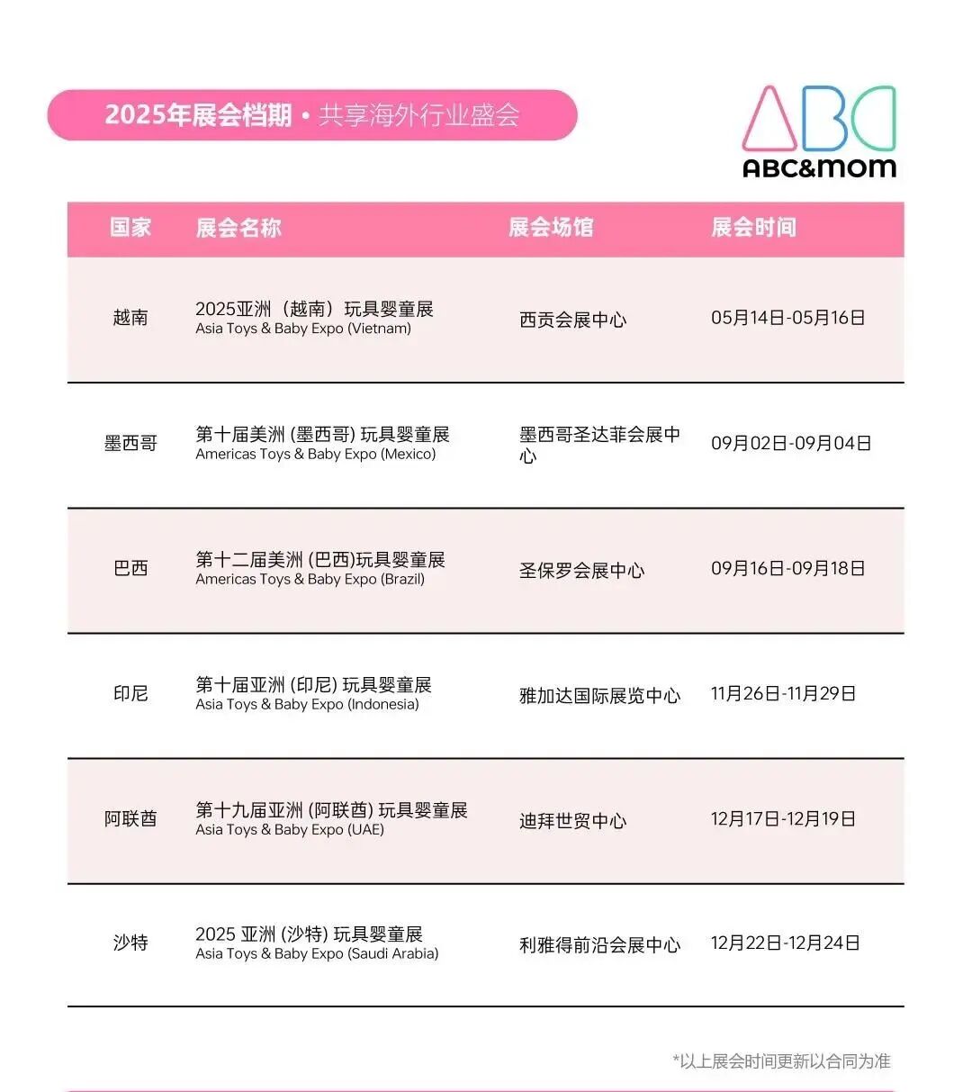 ABC&MOM婴童玩具展作为全球知名的婴童玩具全渠道商贸服务平台,致力于推动和促进全球婴童玩具产业的国际交流与贸易合作。展会为海内外上下游产业提供高效的零距离对接,为品牌推广提供理想的平台和机会,2025将在全球6个热门市场国家举办系列展会。
