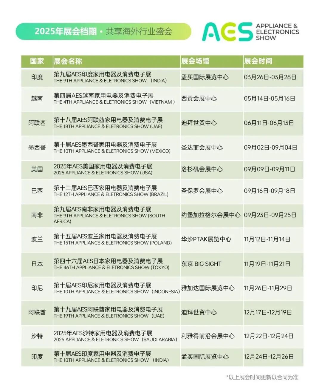 AES家用电器及消费电子展,布局全球多个热门国家和地区,汇聚100,000+业内专业买家,借助数据驱动的数字化专业展,是集海外商机探索、创新产品出海展示、客商精准配对、商业贸易合作为一体的专业展会平台,助力中国企业出海拓展增量市场。