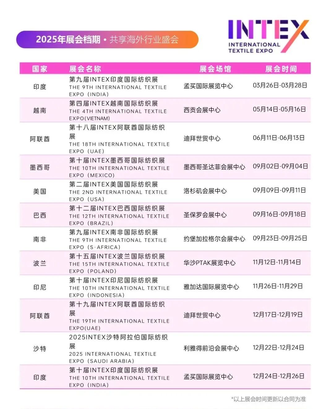 紧跟国家战略,INTEX聚焦一带一路、RCEP、金砖国家经济带,助力中企发掘新兴市场商机!每年在越南、印尼、阿联酋、沙特、日本、德国、美国、南非、波兰、墨西哥、巴西、印度等国举办专业纺织服装展,展品范围涵盖原材料、纱线、面料、辅料、服装服饰、家纺及面料、箱包、鞋业、纺织机械、纺织设备等,充分满足各细分领域出海发展需求。