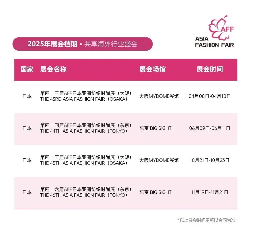 AFF展会全称Asia Fashion Fair,是日本最大规模、最专业的服装成衣展之一。自2003年创办以来,AFF一直在纺织服装行业领域深耕细作,汇聚了中日纺织服装行业的中坚力量。AFF参展企业对日出口能力占每年中国纺织品服装对日出口总额的20%,是日本举足轻重的供应源。