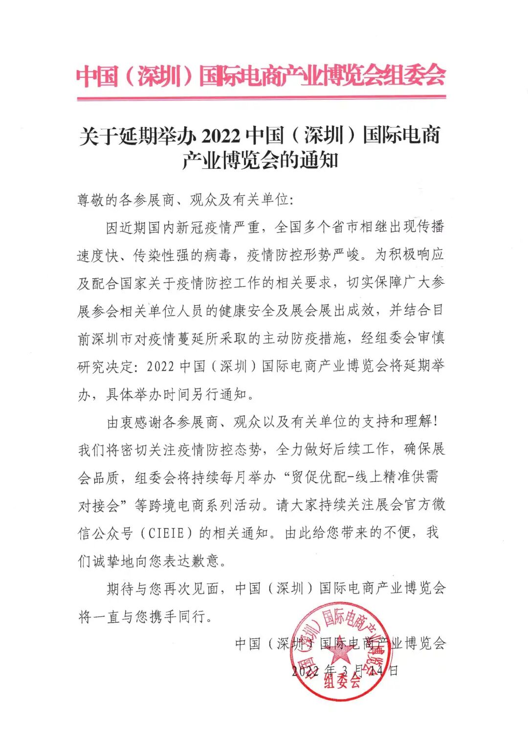 关于延期举办2022中国(深圳)国际电商产业博览会的通知
