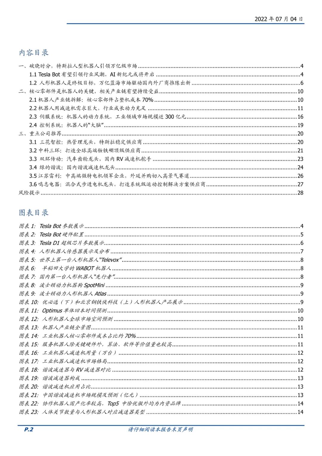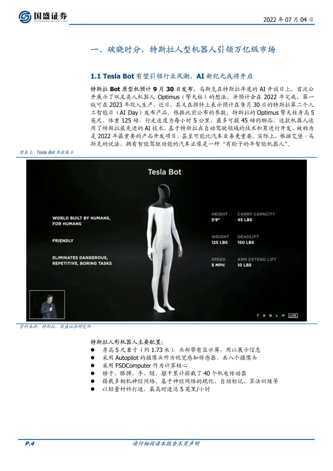 新纪元开启,特斯拉人形机器人有望引领万亿级蓝海市场。特斯拉可能在几个月内推出能够运转的人形机器人原型,其可能是特斯拉2022 年最重要的产品开发项目。Optimus 身高 1.72m,重量 57kg,负载 20kg,其基于视觉神经网络神经系统预测能力的自动驾驶技术驱动,大脑是算力极强的DOJO D1 超级计算芯片,Optimus 机器人的推出,具备极强的标杆带头作用,将为机器人产业链带来重大发展机遇。考虑到特斯拉汽车在中国售价最低为 30 万元左右,预计 Optimus机器人的单体价格大体将位于 17-30 万元之间。假设约 11.6%的劳动者被机器人取代,按价格 25 万元计算,全球人形机器人市场空间可达 100 万亿级别。