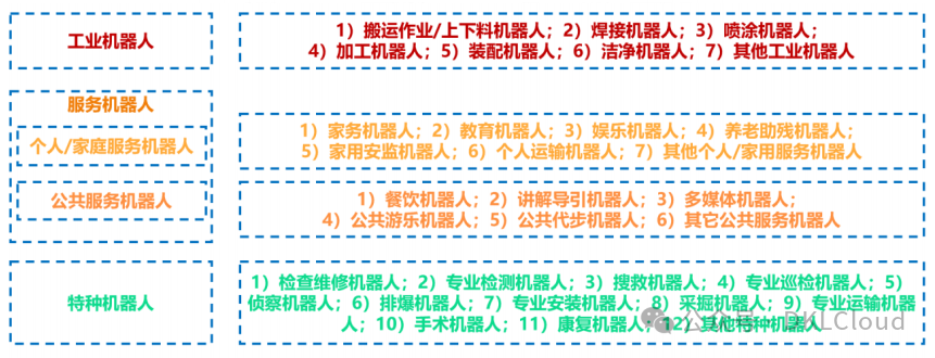 自 2021 年 6 月 1 日起,我国实施了国家标准《机器人分类》(GB/T 39405-2020),该标准根据应用领域将机器人分为以下几类: