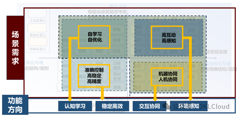 结构化环境的低自主性机器人的需求主要集中在能够稳定完成单一重复性任务,需求准确控制、高稳定和高精度。而其他的场景均需要利用机器人的智能,进行任务和环境学习,因此,自学习自优化的需求覆盖了其他三个象限。而对于非结构环境,如果智能机器人的自主性低,那么会考虑利用机器协同的方式完成复杂任务或辅助人类工作,高自主性的机器人则不仅要全面感知周围环境,还需要能够与人类友好互动。