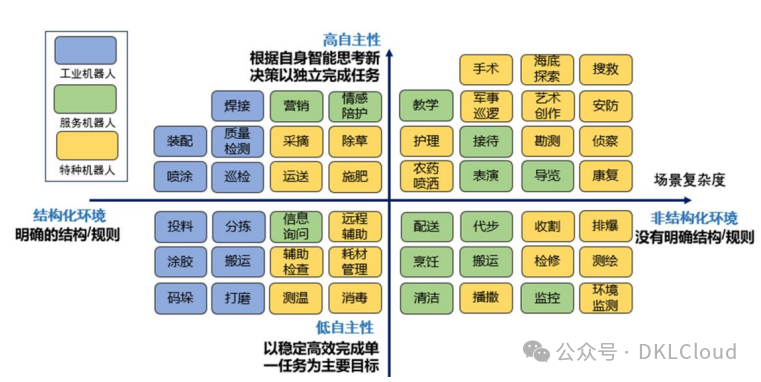 利用横轴与纵轴将机器人根据应用场景复杂度与自主化水平分为四个象限。第三象限为低自主性机器人在结构化环境中的应用,第四象限为低自主性机器人在非结构化环境中的应用,第二象限为高自主性机器人在结构化环境中的应用,第一象限为高自主性机器人在非结构化环境中的应用。