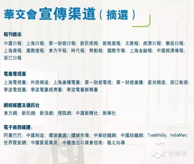 阿里巴巴Alibaba, 中国制造Made-in-China.com, 环球资源Global Sources, 环球市场Global Market Group, 中国纺织网texnet.com, TradeIndia, IndiaMart, 世界买家网Word Importers Net, 中国贸易黄页chinabizpage.com, 中国进出口展会指南China Import and Export Fair Guide, 龙之向导Dragon-guide.net