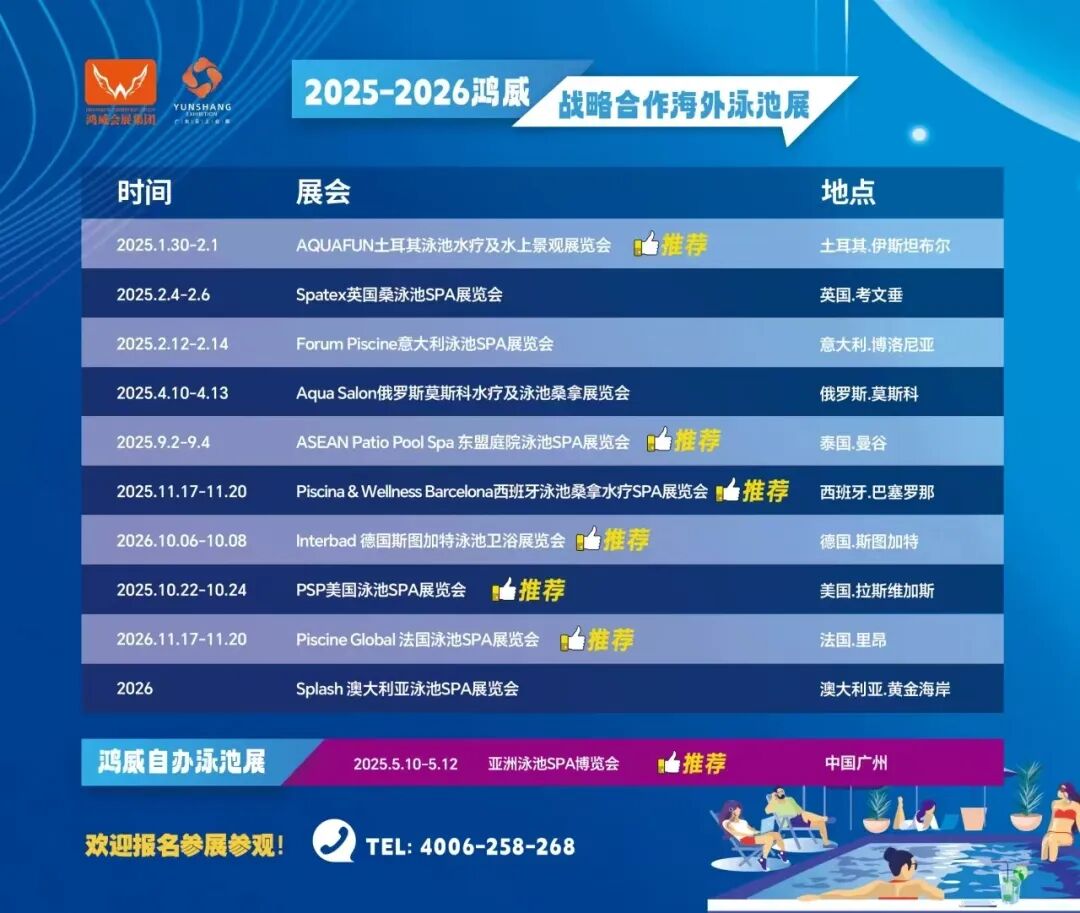 下一步,泳池展组委会将继续与行业同行,全力做好展会的各项筹备工作,提升业务水平,致力于为全球客商提供更加优质的服务,展示泳池SPA行业魅力与风采。5月广州,2025鸿威·亚洲泳池SPA博览会;9月泰国,东盟庭院及泳池SPA博览会待您莅临!