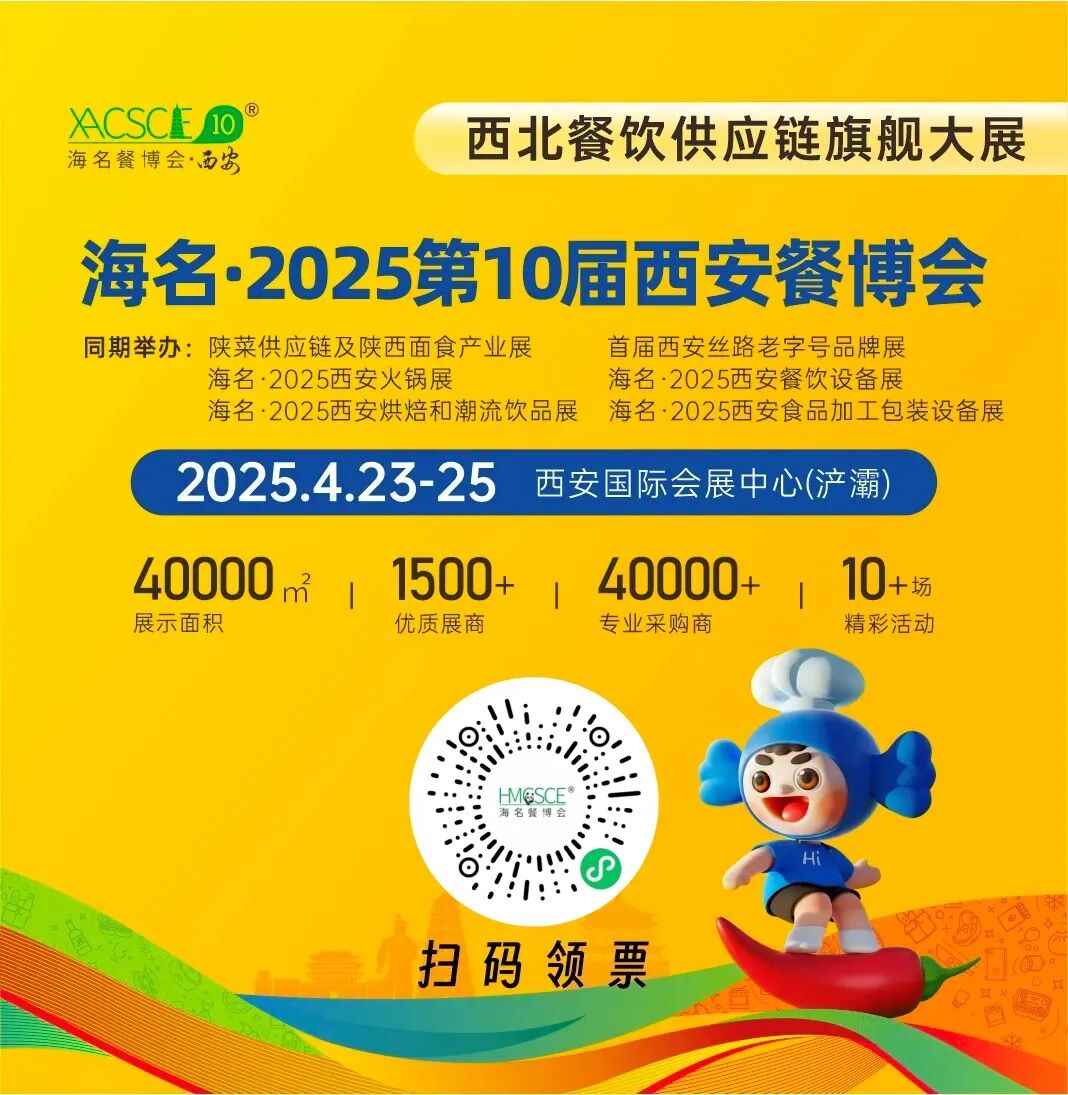 展览详情:海名·2025第10届西安餐饮供应链博览会(简称:海名·2025西安餐博会),将于2025年4月23-25日在西安国际会展中心(浐灞)举办。博览会全面焕新升级,紧密贴合市场需求,聚焦细分品类,对展会主题进行精准定位与全新诠释,整合全行业资源,共创共建,共生共荣,搭建行业大平台,汇聚行业新势力!博览会由六大主题展16大品类、1场大会、8场专题活动、1场行业赛事、N场春季新品发布会构成。同期“海名·2025西安火锅展”、“海名·2025西安餐饮设备展”、“海名·2025西安食品加工包装设备展”、“海名·2025西安烘焙和潮流饮品展”、“陕菜供应链及陕西面食产业展”、“首届西安老字号品牌展”将呈现近40000㎡的中大型展会雏形,再创西北餐饮市场展会规模新高。