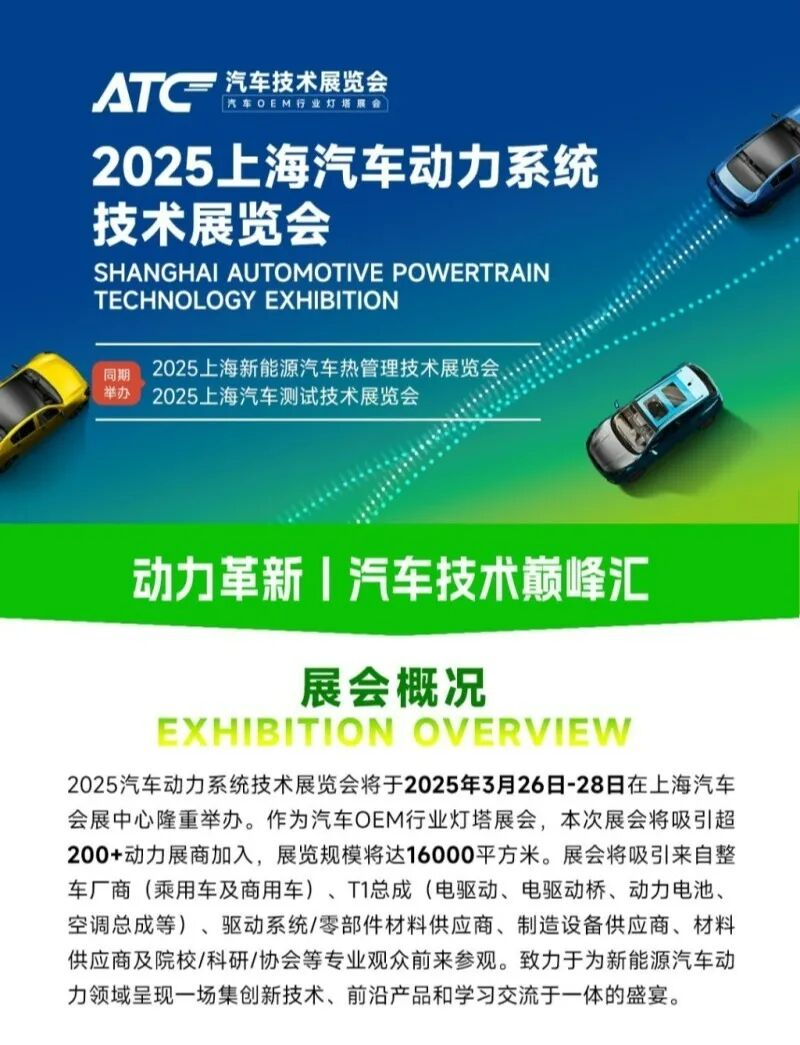 作为汽车OEM行业的灯塔展会,由上海国际汽车城(集团)有限公司指导,ATC汽车技术平台、上海汽车会展中心联合主办的2025上海汽车动力系统技术展览会将于2025年3月26-28日上海汽车会展中心盛大启幕展会重点聚焦新能源汽车电驱动、混动、电池等领域,汇聚300+国内外汽车总成、零部件行业头部企业入,打造从研发到应用落地的横跨汽车产业链上下游的专业展示平台。