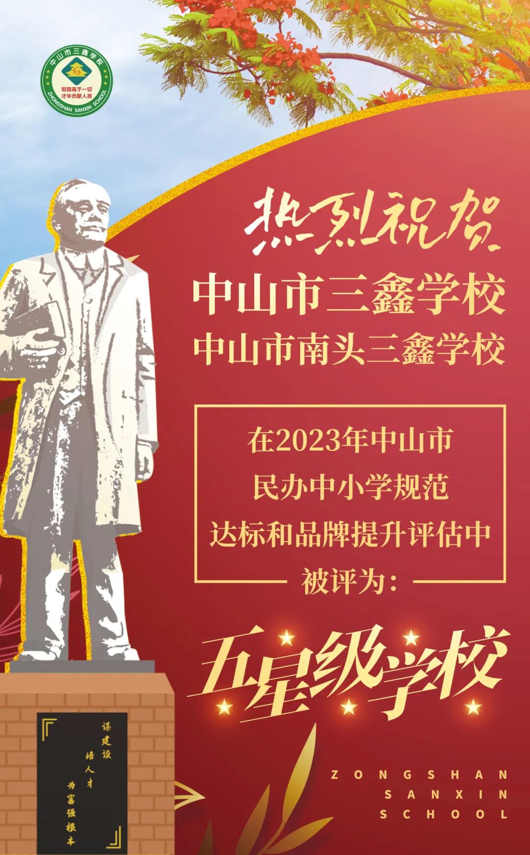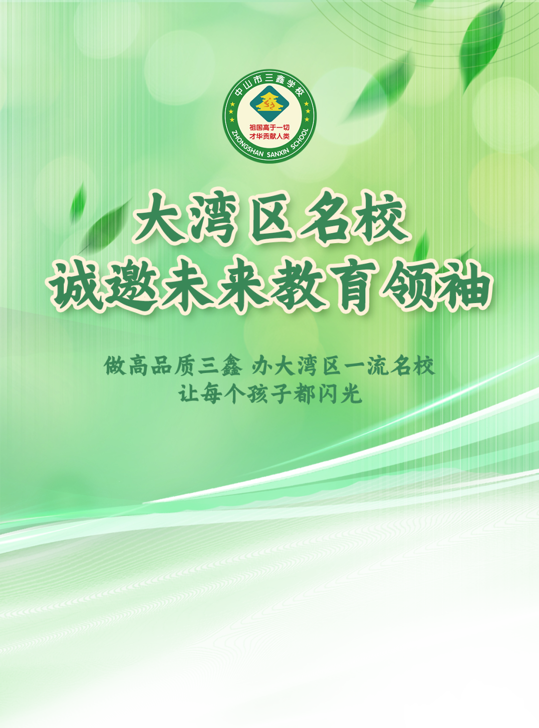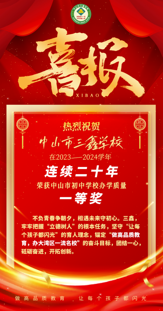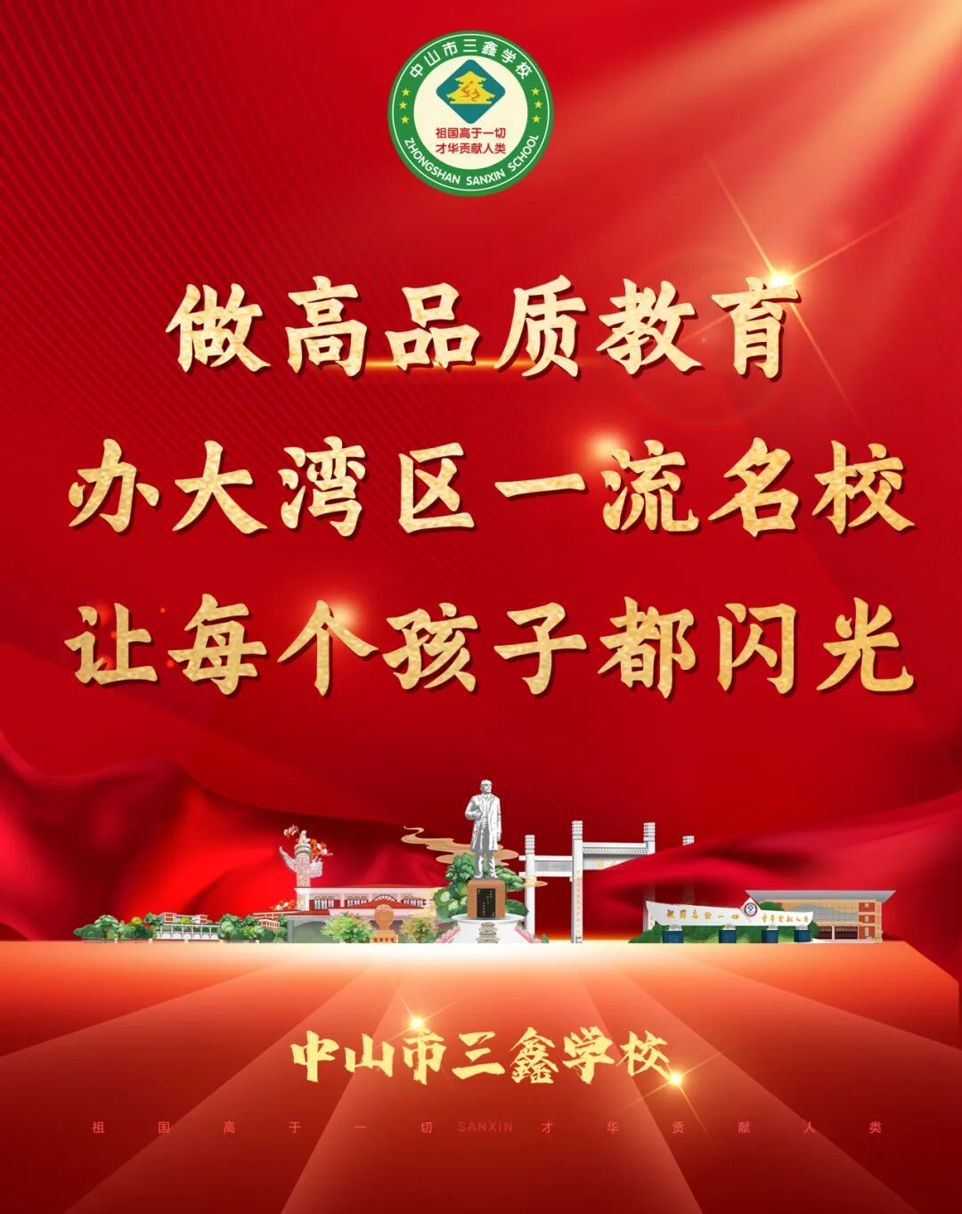 在三鑫,我们筑梦未来,为中华之腾飞,倾力打造卓越教育,奋力成为大湾区首屈一指的名校,让每位学子都能在这里闪光,从这里腾飞!