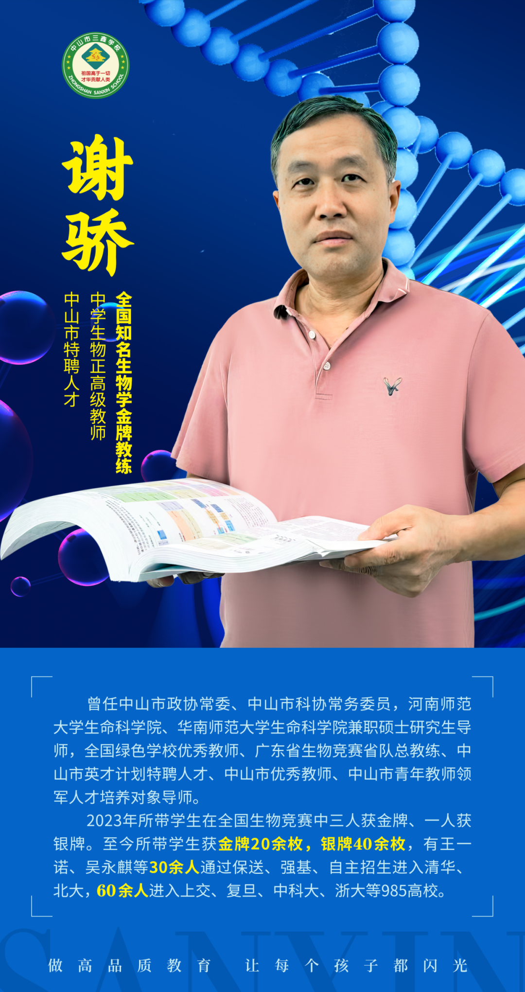 三鑫高中部教师中研究生占30.23%,毕业于985、211大学的教师占38.76%,有20余位从纪中、中山一中、珠海一中引进的特聘专家教师。正高级教师、中山市特聘高层次人才、全国生物学金牌教练谢骄老师于2024年正式加盟三鑫。这里汇聚了毕业于清华大学、北京师范大学、武汉大学、华东师范大学、华中师范大学等名牌大学的优秀教师。他们用卓越智慧点燃学生求知欲望,以渊博学识用心诠释每一堂课,为培养更多的创新拔尖人才提供支撑,共筑教育高峰。